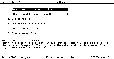If you simply want to burn a CD, gramofile alone does the job. Install it from an RPM or deb file. Figure 1 shows the main menu. I discuss each step further later in this article. gramofile expects a mixer called xmixer, which I found in a Debian package called mctools-lite, but in the RPM world, it is in a package called multimedia. However, there's no problem using whatever mixer you have in another window or console.