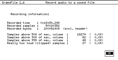 When side one is completed, stop gramofile and verify that the sample levels are reasonable. If not, use your mixer to adjust the levels. Some of the volume spikes are caused by clicks, so a few clipped samples are acceptable.