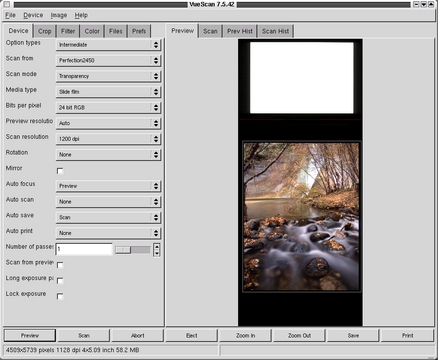 Now that we have a reasonably correct monitor and viewing environment, we can turn our focus to scanning. Both SANE and VueScan are excellent Linux solutions for scanning, I have chosen to use VueScan primarily because it's the same software I use on the Mac. Whichever scanning software you choose, it's important always to use the same software settings. This is vital for correct color, as the ICC profile we are about to create is valid only for the color settings used when making it. In order to make a scanner profile, it's necessary to have a known quantity to scan, called a color calibration target. The target I use is the Q-60 Color Input Target made by Kodak, and it is available from many high-end photo stores. Scan the target using your preferred scanning software; remember to save your settings, and always use the same settings moving forward.