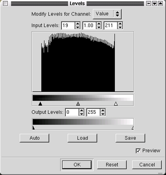 A lot of the tools in The GIMP, as well as other image editing programs, aren't needed for photographic work. Most of my time is spent using the Levels or Curves tools. The first adjustment I make is to the overall exposure, and the best tool for this is Levels. Never use the Brightness/Contrast tool, as it tends to clip values. Open the Levels tool and slide the black and white points right up to the point where data (height) is apparent. Adjust the middle slider to lighten or darken the overall image.