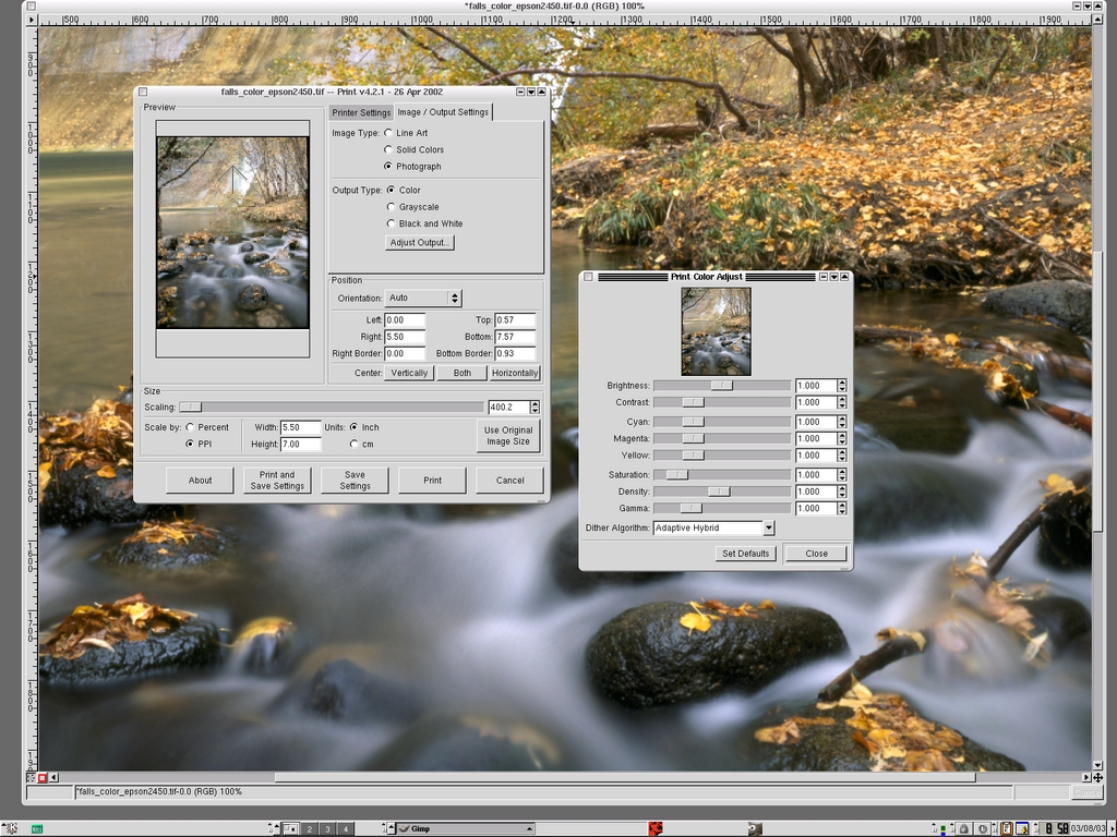 I use CUPS with Gimp-Print when printing to the Epson inkjets. Check the Gimp-Print Web page for instructions on getting this set up and running. By using Gimp-Print, all of the Epson-specific options are available in the Print menu. It also includes the Epson printer utility escputil, which allows for head cleaning and print alignment. Ideally, at this point we would be able to create an ICC profile for our printer; however, no software for Linux exists yet that does this. Instead, I recommend creating a standard set of adjustments using Gimp-Print's color adjust feature. To arrive at these adjustments, use a color test image such as the one we used for monitor calibration. Print the image, and look carefully at the results. You should be able to see details in the shadows and separation in the grayscale step tablet; the neutral and skin tones should not have a color bias. If this isn't the case, open the Print dialog box, select Image/Output Settings→Adjust Output and make the necessary changes. Repeat until your printout looks correct. Once you find a standard set of adjustments, write them down so you can use them as a starting point for future prints.