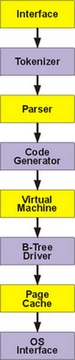 At the top of the diagram is the parser and tokenizer. SQLite includes its own highly optimized parser generator, called the Lemon parser, which produces fast, efficient code, and by virtue of its novel design, it is especially resistant to memory leaks. At the bottom is an optimized B-Tree implementation, based on Knuth, which runs on top of an adjustable page cache, helping to minimize disk seeks. The page cache, in turn, operates on an OS abstraction layer that helps make the library more portable.