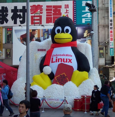 Thought you might be interested in this picture I took across from the main train station in Taipei, Taiwan. It is a very large Linux penguin, dressed up for Chinese New Year. I just finished up with Apricot (the Asian networking conference), and Linux had a large presence in the IPv6 appliances on display, as well as the research being presented. The research lab I work in has many Linux systems. The software engineers do most of their work on Linux and FreeBSD.