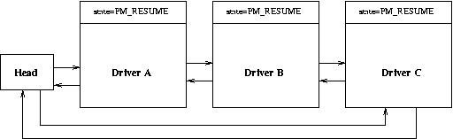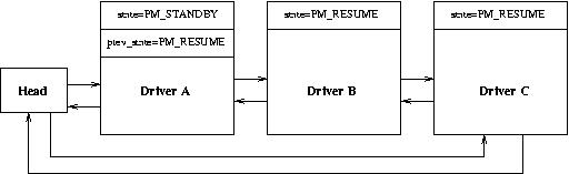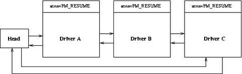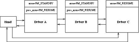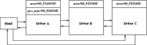 Now we illustrate how a typical state transition takes place when only device drivers are involved. The PM subsystem maintains all drivers that have registered with it in a doubly linked circular list. Figure 2 shows how this list looks when three drivers, A, B and C, have registered with it. This assumes that driver C registers first, then B and finally A.