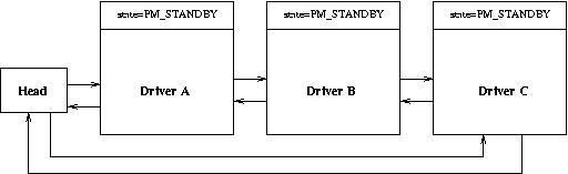 Figure 3 shows what happens when all the drivers have accepted the PM_STANDBY request. Notice how the state field in pm_dev structure is changed when a driver accepts the request.