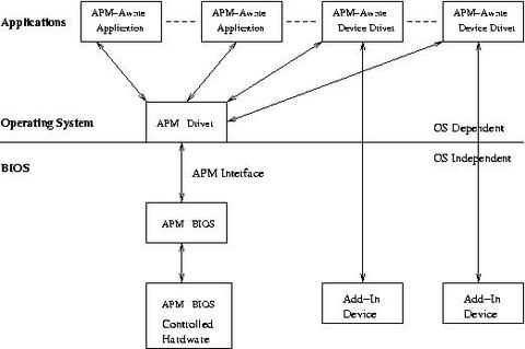 APM BIOS detects and reports various PM events, including low battery, power status change, system standby, system resume and so on. The APM driver uses polling function calls to the APM BIOS to gather information about PM events. It then processes these events in association with APM-aware drivers and applications.