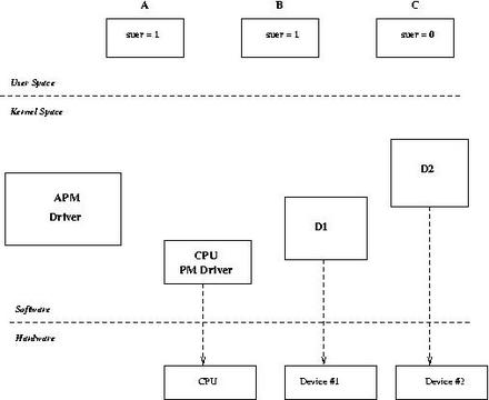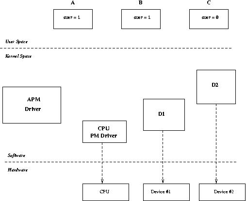 Some of the complexities involved in power state transitions can be understood by taking the example of a state transition involving both drivers and applications. Assume the system has two drivers, D1 and D2, registered with PM and three applications, A, B and C, also participating in PM (by way of opening /dev/apm_bios). Of the three applications, A and B are running with superuser privileges, and C is not. Figure 8 depicts this scenario.