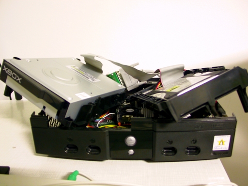 Figure 3. The Xbox dissected: the Philips DVD drive is on the left, and the Seagate hard disk is on the right. The green board in the background is a modchip that is, in this case, connected to a computer's parallel port.