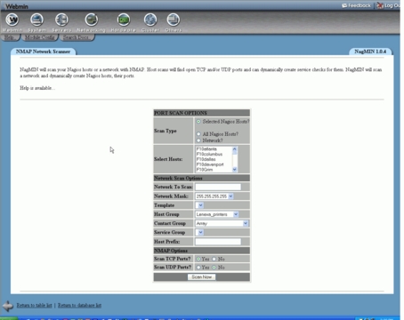 That last statement brings up an interesting point: an add-on came out in March 2003, a Webmin plugin for Nagios (Figure 2), called NagMIN. Not only does it allow web-based configuration of Nagios, like Nagat, it offers a few things that nothing else has offered so far. First, it offers database support of the Nagios configuration files. Second, something quite useful if you are starting to set up your Nagios install, is the port scan feature (Figure 3). I have not tried out this feature fully yet, but it claims to perform a network discovery and turn what it finds into Nagios configuration files, saving you the trouble of having to enter all the data yourself. NagMIN should work with most systems, but the more-specialized monitoring most likely still has to be entered into the system by hand. If you would like more information about this plugin, go to the SourceForge.net web page.