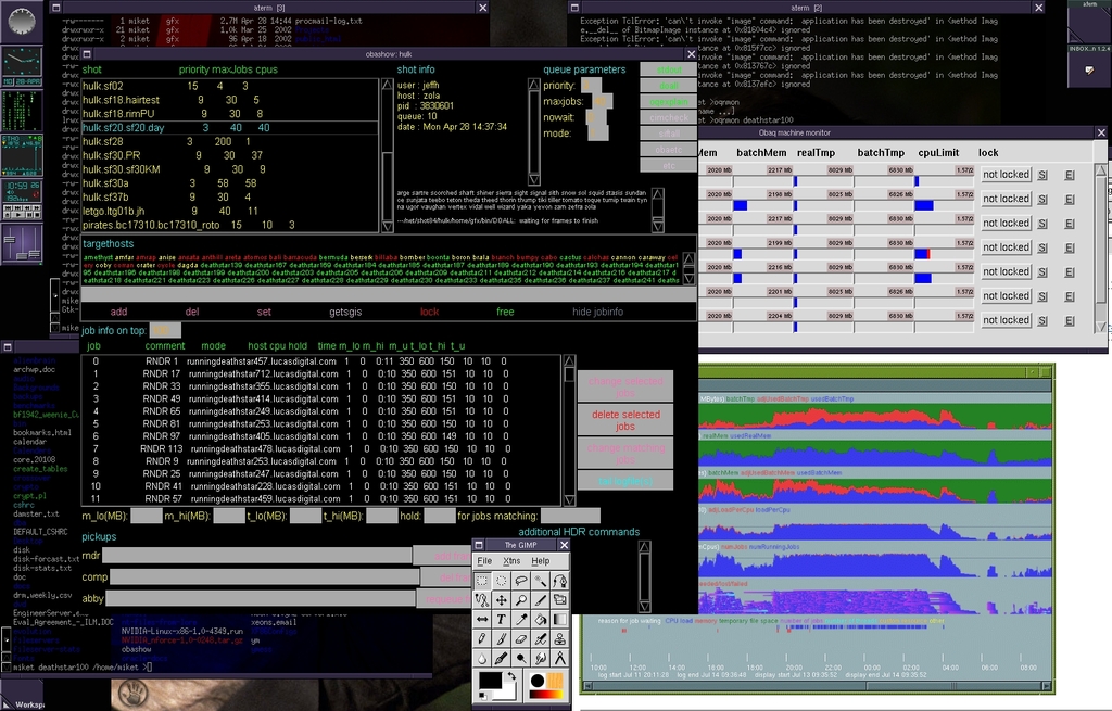 “Our core renderfarm is comprised almost entirely of Linux boxes since we switched over from SGI machines”, says ILM Systems Developer Mike Thompson. “We have about 750 nodes—1,500 CPUs.” The renderfarm exists as a row of computing towers made up of 1U rackmount dual-processor PCs. However, this isn't a supercomputer in the classic sense. Each machine operates semi-independently in a grid configuration, not bound together as a supercomputer running a single job. At ILM, a proprietary batch-scheduling program called ObaQ manages the workload across machines.