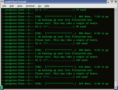 After running the command, mondoarchive checks your system, makes sure everything is okay and begins its backup process. It continuously shows its progress during the process (Figure 1) and may take a while to complete. When it finally is finished, it asks if you want to create boot disks. You can answer no, because the CD you burn will be bootable. If you want or need the disks, say yes.