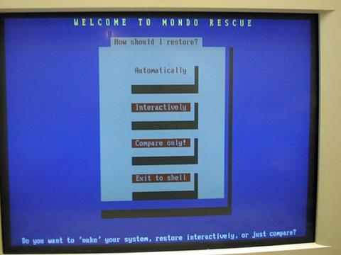 To use mondoarchive in interactive mode, boot to the CD and type interactive. A menu appears asking you how you want to restore (Figure 2).