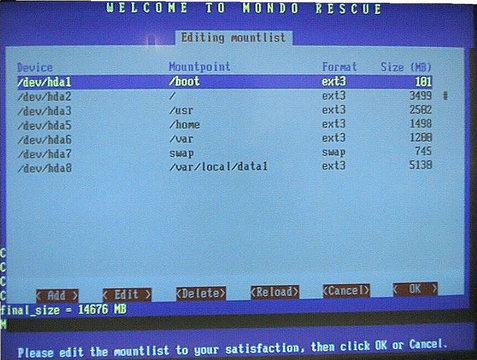 Mondo then opens up /etc/fstab and lilo.conf/grub.conf for editing in vi. You should make changes accordingly so they match your new mountlist: