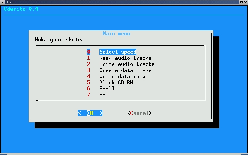 Got X? No? But there's too much to remember to burn a CD on that VT-only server with the brand new high-performance CD burner? Miss your xcdroast, gcombust, k3b, whatever? Try cdwrite. It takes the pain out of creating a data image and writing it or reading and writing audio tracks. If you have the tools installed, you don't have to keep re-reading the man pages simply to burn an image. Requires: bash, cdparanoia, cdrdao, mkisofs, cdrecord.