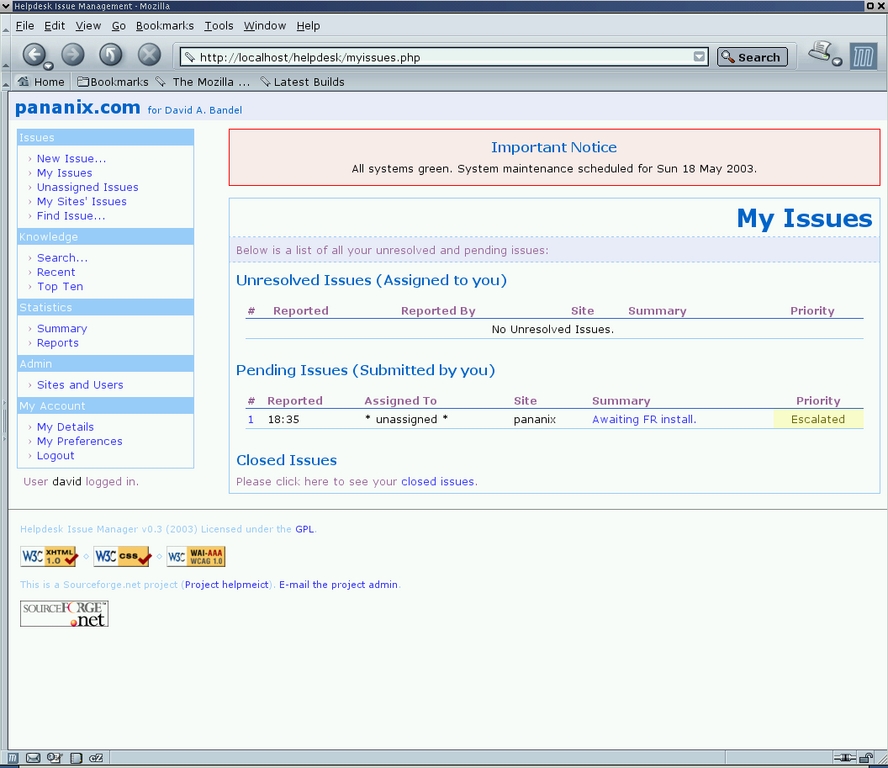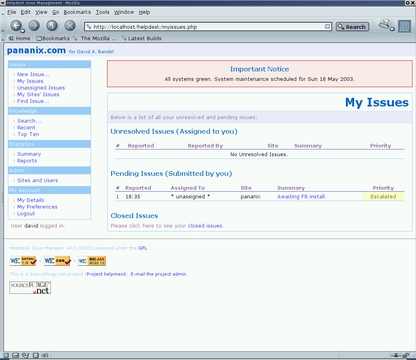 This Web help desk allows various levels of users, from clients to support personnel to site contacts to administrators, to track trouble tickets. The system is easy to set up and use. Each user can configure their preferences as needed. If e-mail support is desired, you'll need an MTA, such as sendmail, running on the system. Requires: Web server with PHP and PostgreSQL support, PostgreSQL server, Web browser.