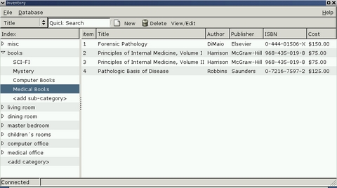 It slices. It dices. You can sort it, search it, export it or import it. You create the categories and subcategories, then create the columns as any of Boolean, Integer or String. In fact, this looks like a nice utility to use for any number of applications, not only for inventory, but how you abuse it is strictly up to you. I doubt anyone will say anything if you used it as a to-do list or address book. Few things beyond pencil and paper are this flexible, and almost none are as powerful. Requires: libgtk-x11, libgdk-x11, libatk, libgdk_pixbuf, libm, libpangoxft, libpangox, libpango, libgobject, libgmodule, libdl, libglib, libmysqlclient, glibc, libXi, libXext, libXft, libX11, libz, libXrender, libfontconfig, libfreetype, libcrypt, libnsl, libexpat.