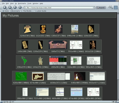 This Perl script is simply too easy. You create a directory, copy all the files you want to show on a web page into it, then run jigl.pl from inside that directory. This gives you instant thumbnails, web pages for each thumbnail, and you can look through the slides one by one. You can customize using various templates that aren't difficult to manage. Requires: Perl, ImageMagick, jhead.
