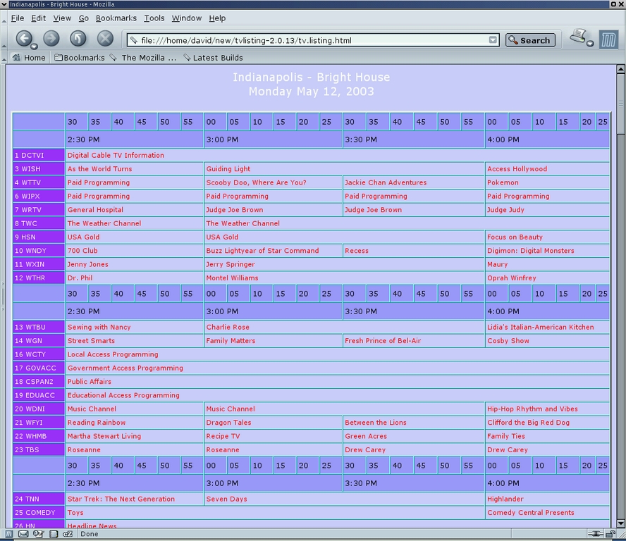 Want to know what's on the tube tonight? This simple Perl program shows you in any of a number of formats, although HTML is probably the easiest to read (and is the default). So, if you have free time coming up soon, you can check out the movie listings ahead of time. I think I'll check for the next episode of FarScape. Requires: Perl, Perl Modules HTML::TreeBuilder, HTML::Tagset, HTML::Parser, Web browser.