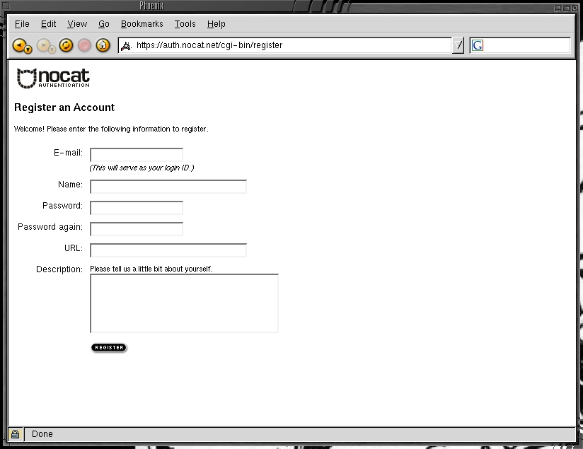 max-lease-time 120; default-lease-time 120; allow unknown-clients; subnet 192.168.1.0 netmask 255.255.255.0 { option routers 192.168.1.1; option broadcast-address 192.168.1.255; option subnet-mask 255.255.255.0; option domain-name-servers 192.168.1.1; range 192.168.1.100 192.168.1.254; }Compile and install NoCat.