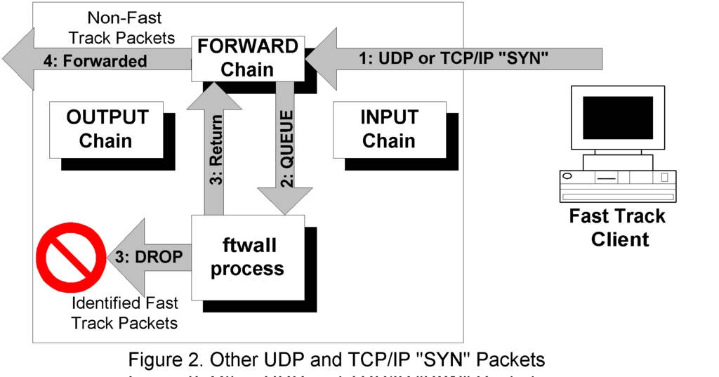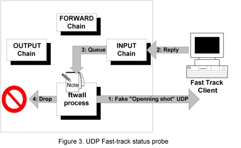 When FastTrack receives the spoofed reply, it tries to use UDP to request some extra setup information and then attempts to make a TCP/IP connection to the same address. These UDP and TCP packets are passed to ftwall, which now knows that the destination addresses refer to FastTrack, and so it drops them (Figure 2). Other UDP non-FastTrack packets and TCP/IP SYN packets are returned to Netfilter for further checks and forwarded to their destination.