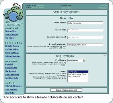 Big Medium 1.1 is Web-based content management software that allows nontechnical staff to add, edit and publish Web content to multiple sites without needing to know HTML. Designed for Web servers using UNIX and its variants, Big Medium allows rapid setup of new sites based on preconfigured specifications for design, layout and content. Current skins are available for news and product tours, with more available soon. Big Medium's features include duplication and backup of Big Medium sites; a review sites option to browse, edit and delete any content; and automated application on a skin to an existing site. Written in Perl code and using standards-compliant HTML/XHTML, Big Medium is available for a free trial download from demo.globalmoxie.com.