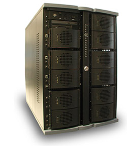 The ProStore SATA (serial ATA) storage system offers multiple terabyte storage capacity for data-intensive applications, including clustering, digital content creation and scientific visualization. ProStore contains 36 serial ATA drives in a 4U chassis and can be scaled to 9TB using current SATA drive capacities. 200GB serial ATA disk drives are used in the ProStore, as are the Intel E7501 chipset, dual Xeon 3.06GHz processors and up to four 3ware Escalade 8500 serial ATA RAID controllers. Additional features include hot-swappable hard drives, power supplies, dual 10/100/1000 Ethernet interfaces and RAID support for reliability and redundancy.
