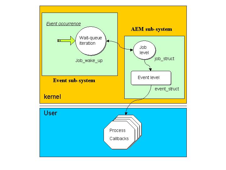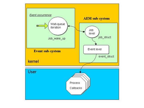 AEM is a three-layer architecture composed of a set of pseudo-system calls for event management, a per-process event_struct performing event serialization and storing context information in order to execute user callbacks and a per-event job_struct performing event activation.