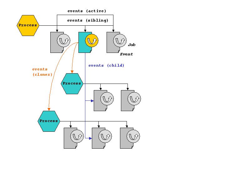 Some process events are active and linked to an active events list. Upon activation, an event can create a process. These events are called cloners, and the relationships between these events and created processes are recorded internally. An event registered by the top process in Figure 3 has created two new processes below it. They remain attached to this event and keep their own list of events.
