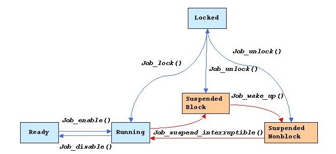 Our implementation of periodic and reactive jobs is different in both cases in order to obtain a better throughput in case of sporadic events. A job scheduler and a dispatcher handle periodic jobs, whereas reactive jobs change state themselves for performance reasons. Figure 4 describes the job state evolution and functions used to move from one state to another.