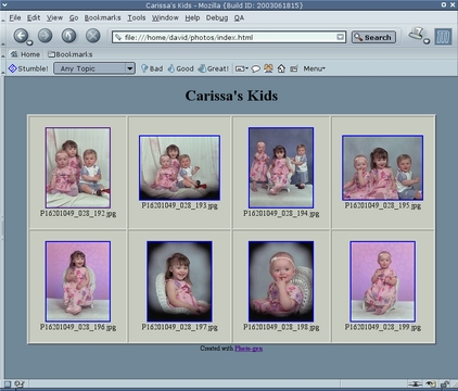 PhotoGen is another great, easy-to-use script to create a Web album of photos effortlessly. Scripts like this make it easy for anyone to create an index page of thumbnails and directly transfer the entire directory to a Web server. With a quick link to the directory, anyone can view your photos. Requires: bash and ImageMagick.