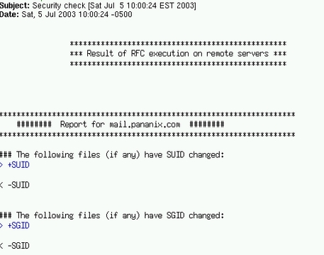 The remote filesystem checker (RFC) allows you to run filesystem checks on a number of remote systems from one master node. RFC uses SSH to log in and check each system. This can be run nightly from cron and a report is sent to the administrator, which lets you see a number of systems on one report rather than getting one from each individual system. Requires: OpenSSH, BASH, cron, Perl and AIDE (optional).