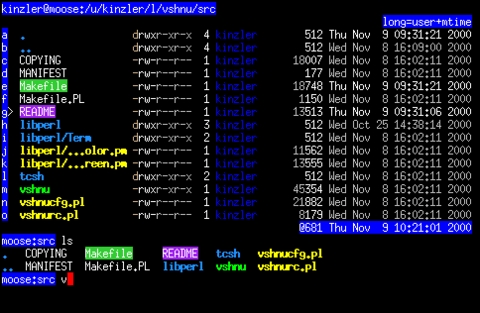 A variation on a shell, this particular “shell” provides a graphical environment for a virtual terminal, while still allowing access to the underlying system. Properly setup, vshnu could serve as a batch menu file for new users. Written in Perl, all of Perl's power is available from vshnu. If you want a change from your standard CLI, this is worth a look, though it takes a little getting used to. Requires: Perl, Perl modules: Term::Screen, Term::ANSIColor, Term::ReadLine::Perl and a termcap file.