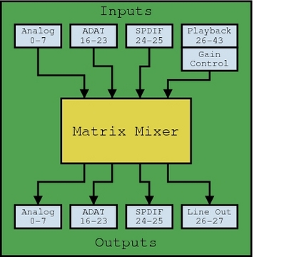 Sound routing is the most powerful feature the HDSP has to offer. Unfortunately, because it is not a feature found on many sound cards, the interface used to control it is not an ALSA standard. As of ALSA version 0.9.3, the matrix mixer interface is somewhat of a hack and is subject to change. It's possible to write values to it but not to read them back. In any case, the syntax used is source,destination,gain, where gain is as explained above, and source and destination are as follows: