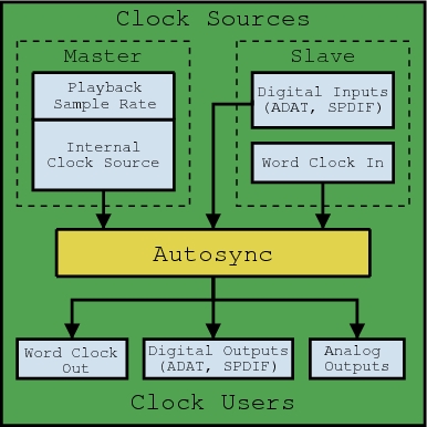AutoSync decides which clock signal to use. This is controlled by the Sample Clock Source setting and the Preferred Sync Reference setting. The former, Sample Clock Source, determines if the HDSP operates in Master or Slave mode. Its possible settings are as follows: