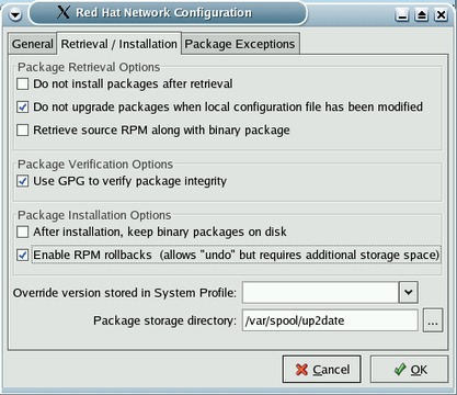 In Red Hat 9, up2date supports rollbacks using RPM's transactional rollback mechanism. Configuring it to support transactional rollbacks is as simple as running up2date-config, clicking the Retrieval/Installation tab and then clicking the Enable RPM rollbacks check box (see Figure 1). You have to configure RPM itself as described in the previous section. When you upgrade your system using up2date, once you have configured both RPM and up2date, RPM creates the repackaged packages of RPMs you are updating before it upgrades those packages.
