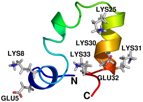 The Villin headpiece is a very small protein consisting of about 600 atoms. However, the cell is always surrounded by water (red/white rods), which brings the atom count up to about 10,000. Every single atom interacts with the closest 100–200 neighbors; the interactions have to be calculated every single step, and then we repeat this for a half-billion steps to generate a microsecond of simulation data. The data for Figure I was generated from a two-week run on ten of Iceberg's nodes.