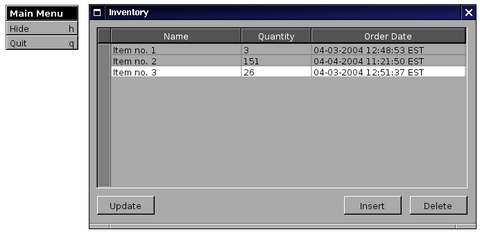 Once the steps related to the database are completed, we now proceed, with Gorm, to create the user interface for the inventory application. To do so, open the modeler and from the Document menu, choose New Application. From the Inspector window, set the window title to Inventory. Then, from the Palettes window, drag a NSTableView object to the application's window and insert a third table column using copy/paste. Set the table columns' titles to Name, Quantity and Order Date. Also, set the table column identifiers to name, quantity and order_date respectively. Then, drag three buttons from the Palettes window to the application's window and set their respective title to Update, Insert and Delete.