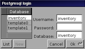 Once the application has finished launching, -applicationDidFinishLaunching: is automatically invoked. In this method, we added the code to initialise EOF from our model. We also run the PostgreSQL's adaptor login panel (shown in Figure 3) in order to specify the user name/password and database name we want to use. In the future, GDL2 will offer the possibility to create databases directly from the login panel. For now, from this panel, enter inventory in the Username: and Database: fields, the password you assigned to the inventory user when creating it in the Password: field. Then, click on the Ok button.