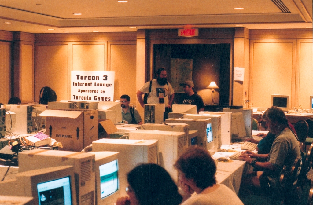 Since 1996, the conventions have featured an Internet Lounge where attendees could check their e-mail while at the convention. Given my background with Internet service providers, volunteering for the Lounge seemed the best task for me. I was working for a charity that refurbishes old corporate computers for reuse by other charities and individuals that otherwise would not be able to afford computers. Through my employer, I was able to arrange for enough computers for the convention, the only price being that they wanted their current project, torontogames.org, promoted. The only catch was that the machines would not come with any sort of operating system.
