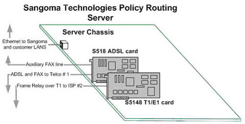 Sangoma is a manufacturer of PCI-based WAN interface cards. For demonstrations and redundancy, we have two separate high-speed Internet connections: a full T1 carrying Frame Relay, using our PCI S5148 T1/E1 modem, and an ADSL connection carrying PPPoE over ATM, using our PCI S518 ADSL modem. The ADSL line is shared with our fax machine, the only telephone line not connected to our PBX. We use two different ISPs for the services. The ADSL and fax telephone line are provided by Bell Canada's Sympatico service, and the T1 Frame Relay connection is provided by MCI.