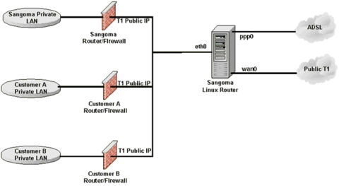 The two Sangoma Linux machines could be combined into one quite easily. The combination router would have another NIC to support the public network segments to customers A and B. Sangoma's firewall would operate between Sangoma's private LAN segment and all the other public segments, which include the Frame Relay T1 link, the ADSL link and the public Ethernet link.