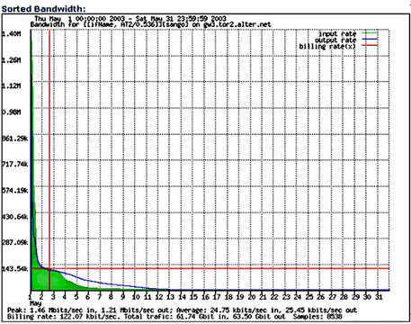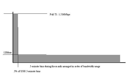 This complicated billing structure is hard for subscribers to understand. It looks like a good deal to the customer but is difficult to manage and hard to measure. The billing rate is measured at the 5% level, where the rate of change of the usage curve is near a maximum. So, many users find themselves paying high bills that depend on the bandwidths of only one or two five-minute bins out of the more than 8,500 bins measured each month. Unless one's traffic is consistently low, one quickly finds that the surcharges are such that one may as well bite the bullet and take the full T1, even though the average throughput may be well below 128kbps.
