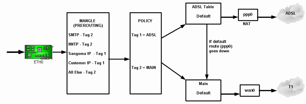 The first step is iptables mangle rules where traffic is tagged as either Tag 1 for ADSL or Tag 2 for T1. To give all Sangoma mail Tag 2, for example, we apply the rule:
