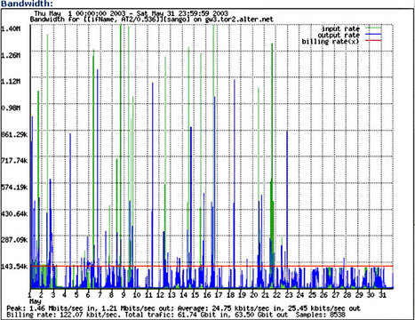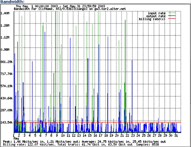 As an example of our T1 traffic management see Figure 5, which shows Frame Relay T1 bandwidth usage during May 2003. The red line on the graph represents 128kbps, which is our threshold limit for billing. Throughput clamping occurred after May 23. One of our customer's servers became infected with a virus that generated a great deal of traffic during the month, consuming our precious free bandwidth. As a result, these customers were required to exist for more than a week running at 128kbps on the T1 line. ADSL traffic, of course, was not affected.