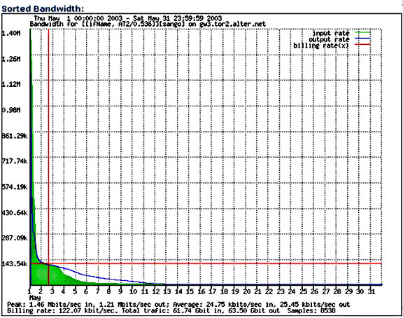 The financial contributions from customers A and B are not enough to pay for a full T1 at Canadian prices. The solution for us was to employ a usage-based service for T1. This is a so-called burstable T1 service, which is about half the price of a full bandwidth T1 line. The T1 use is unrestricted up to the full bandwidth of 1,536Mbps full duplex. Billing is based on the 95th percentile of the bandwidth used. Traffic is sampled in five-minute intervals, and the average bandwidth for the five minutes is calculated. At the end of the month, these five-minute bins are arranged in decreasing order of bandwidth. The top 5% are discarded, and the billing rate depends on the next highest bin for the month. The trigger throughput in our case is 128kbps. If our 95th percentile throughput exceeds 128kbps, the monthly line charge is incremented by a minimum of $300.
