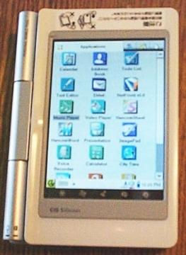 The SL-C760 features both Compact Flash and Secure Digital/Multi-Media Card slots, creating more external storage capabilities than most users are likely to need. Now that the screen occupies the full height of the 760 in portrait mode, the OK and Cancel buttons have been moved to the side. There's also a smooth-action jog wheel similar in functionality to the touch ring on earlier Zaurus models. The power button has been moved to the side, as well. The 760 also has removed one of my personal annoyances from the SL-5x00 models, the requirement to hold the power button to move into standby mode.