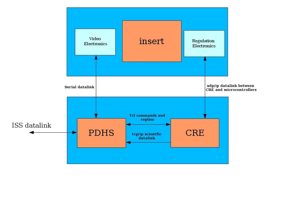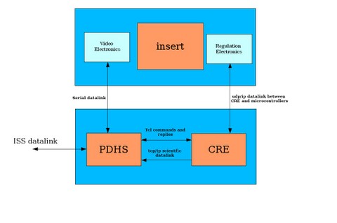 Temperature control is handled by the CRE. The regulation electronics and software are able to control different types of thermostats inserted in the first box. In the previous experiments, one used fluids with a critical point of about 45°C; this will be done again in the first insert.