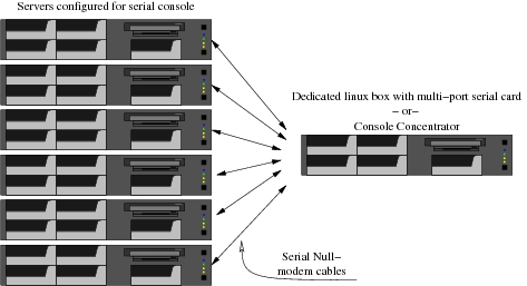 For remote access to a server's console, you can set up a console concentrator, which is a lot like a terminal server. It can be a homegrown Linux box with multiport serial cards, giving you as many ports as you have servers. With this kind of setup, you can access all your servers' consoles by logging in to a single dedicated Linux box.