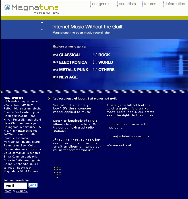 Figure 1. The Magnatune home page (magnatune.com) answers visitors' top eight questions.