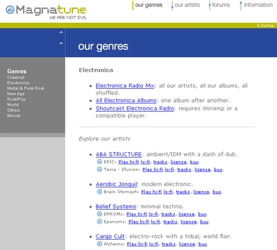 Figure 2. “Play” links on the Electronica page (magnatune.com/genres/electronica) offer immediate gratification.